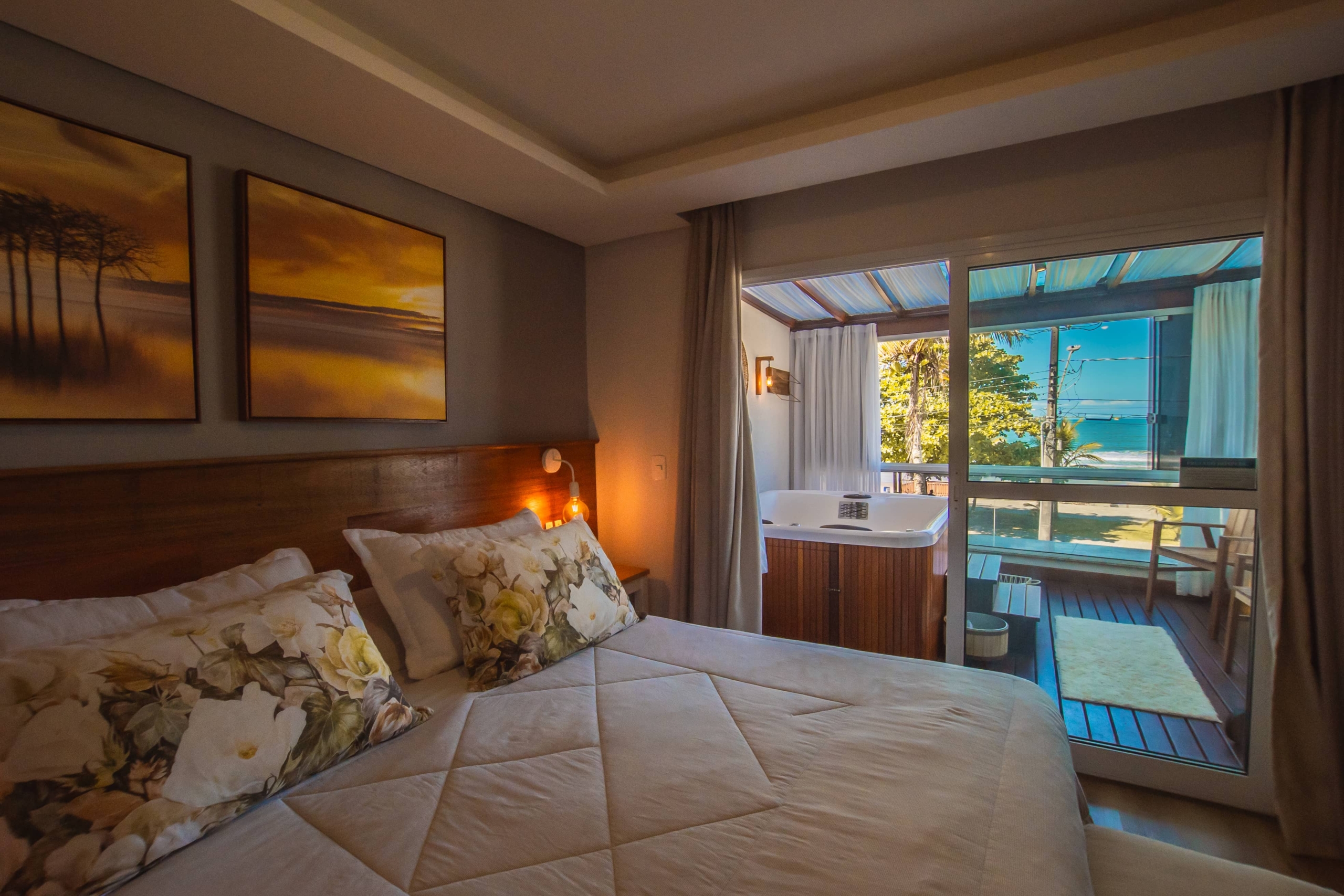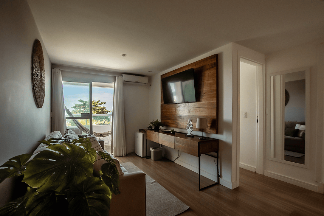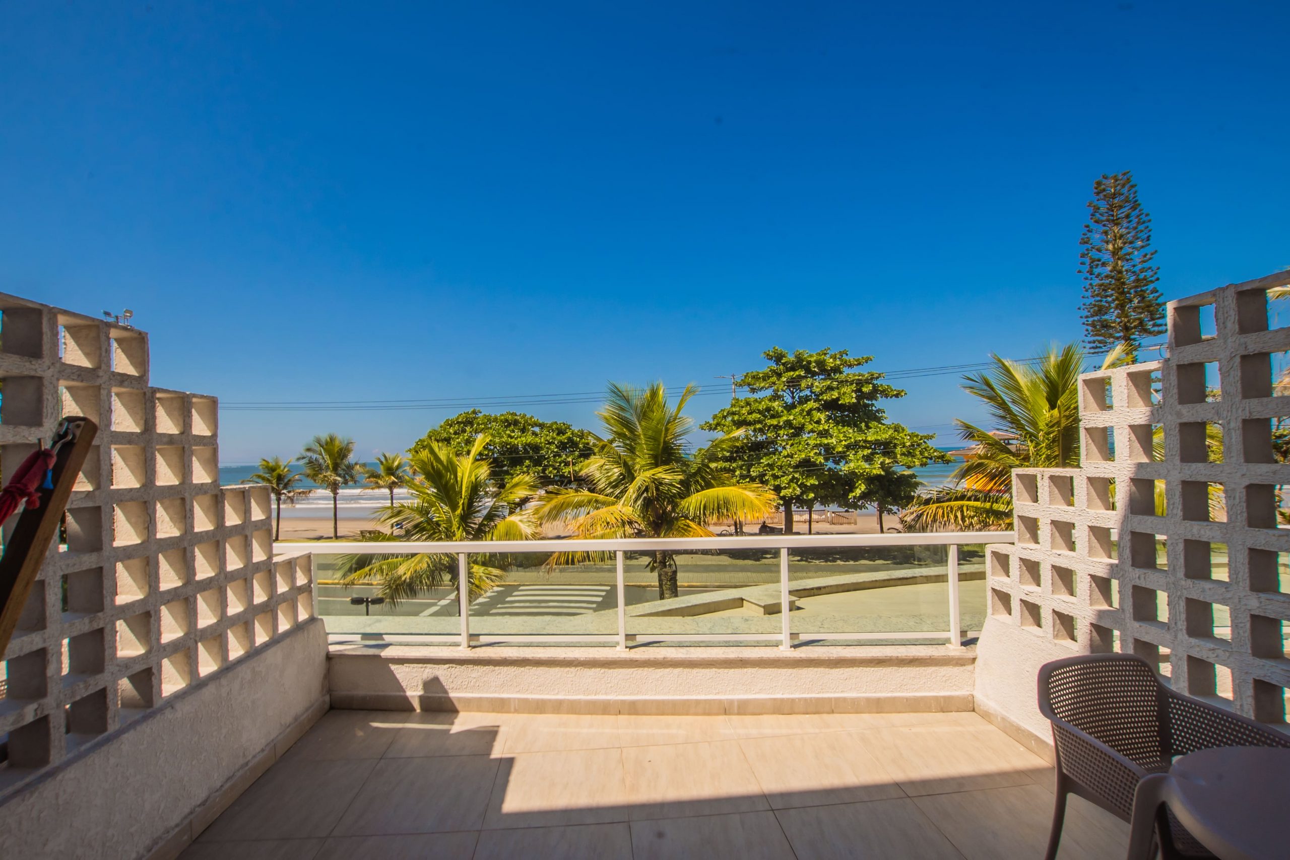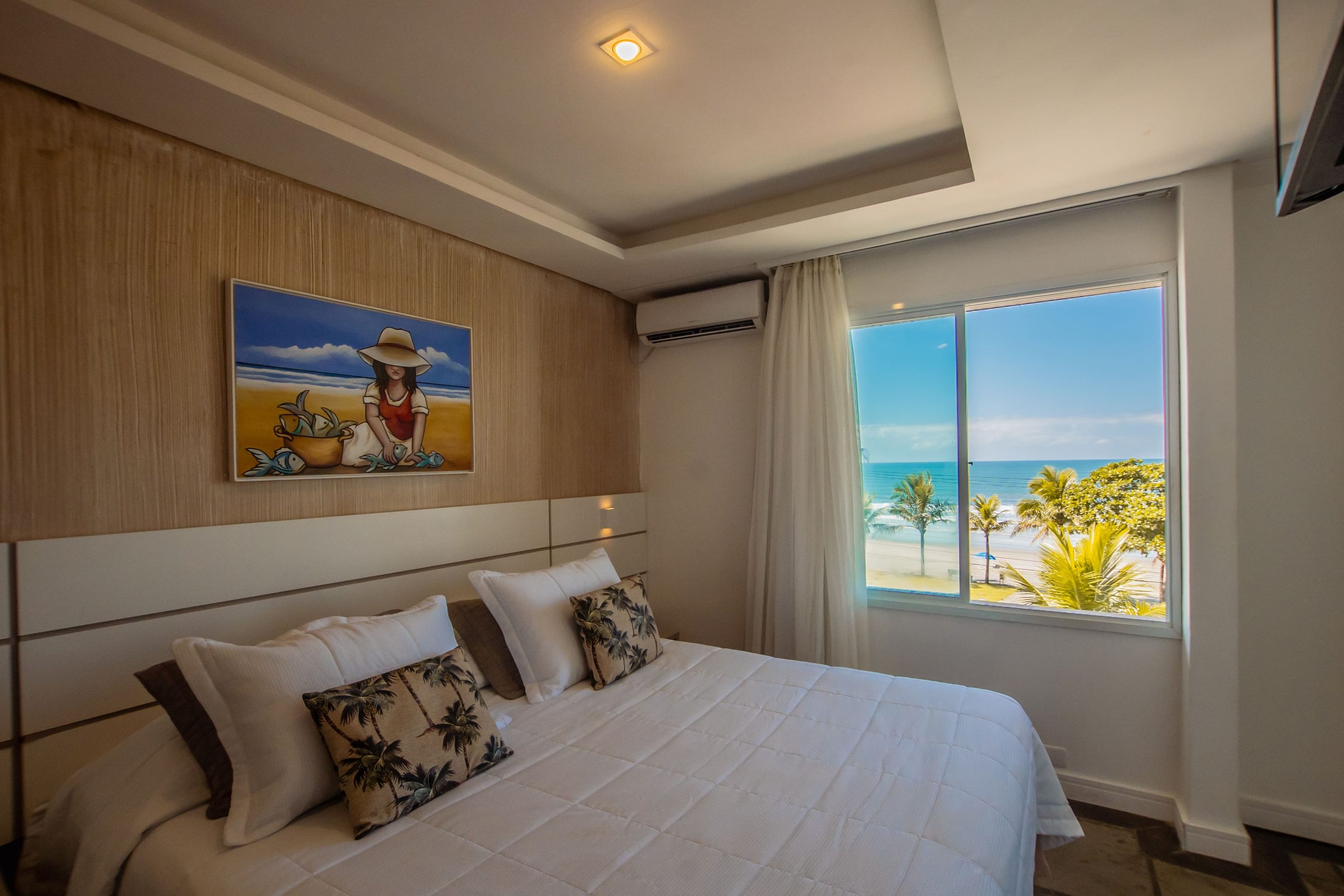 Apartamento com decoração moderna, frente para o mar, com sacada e hidromassagem.