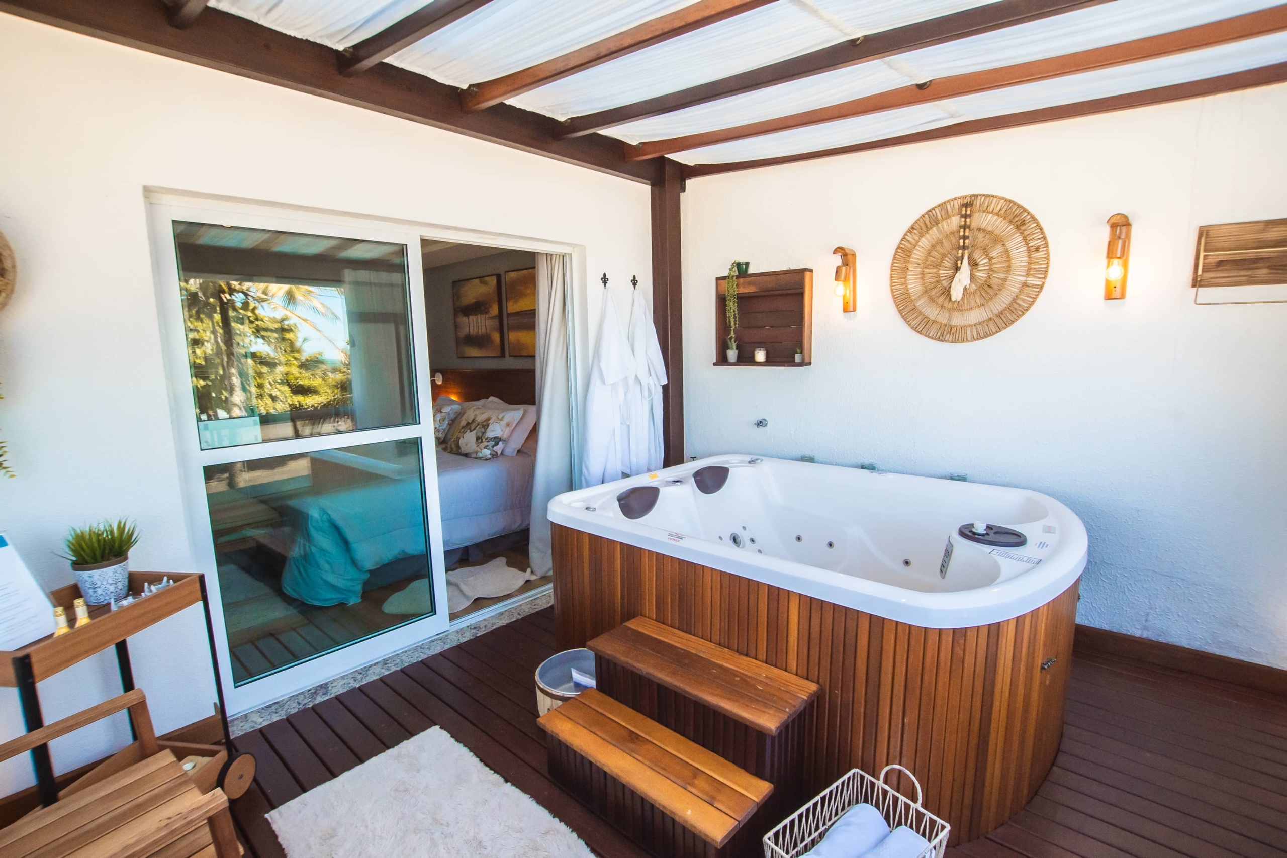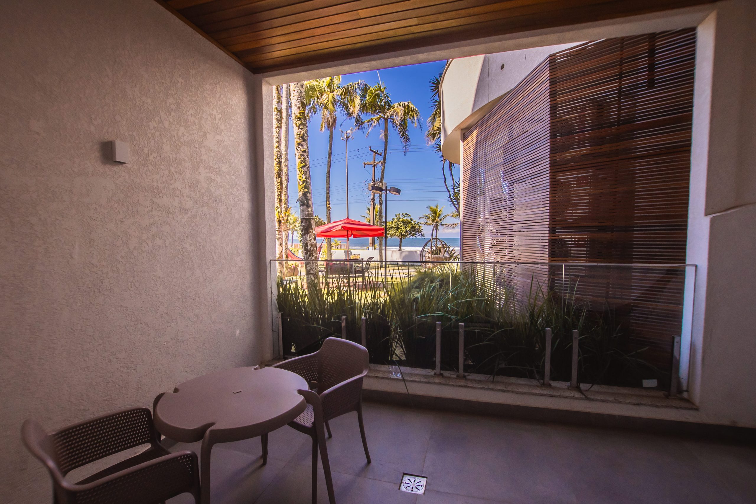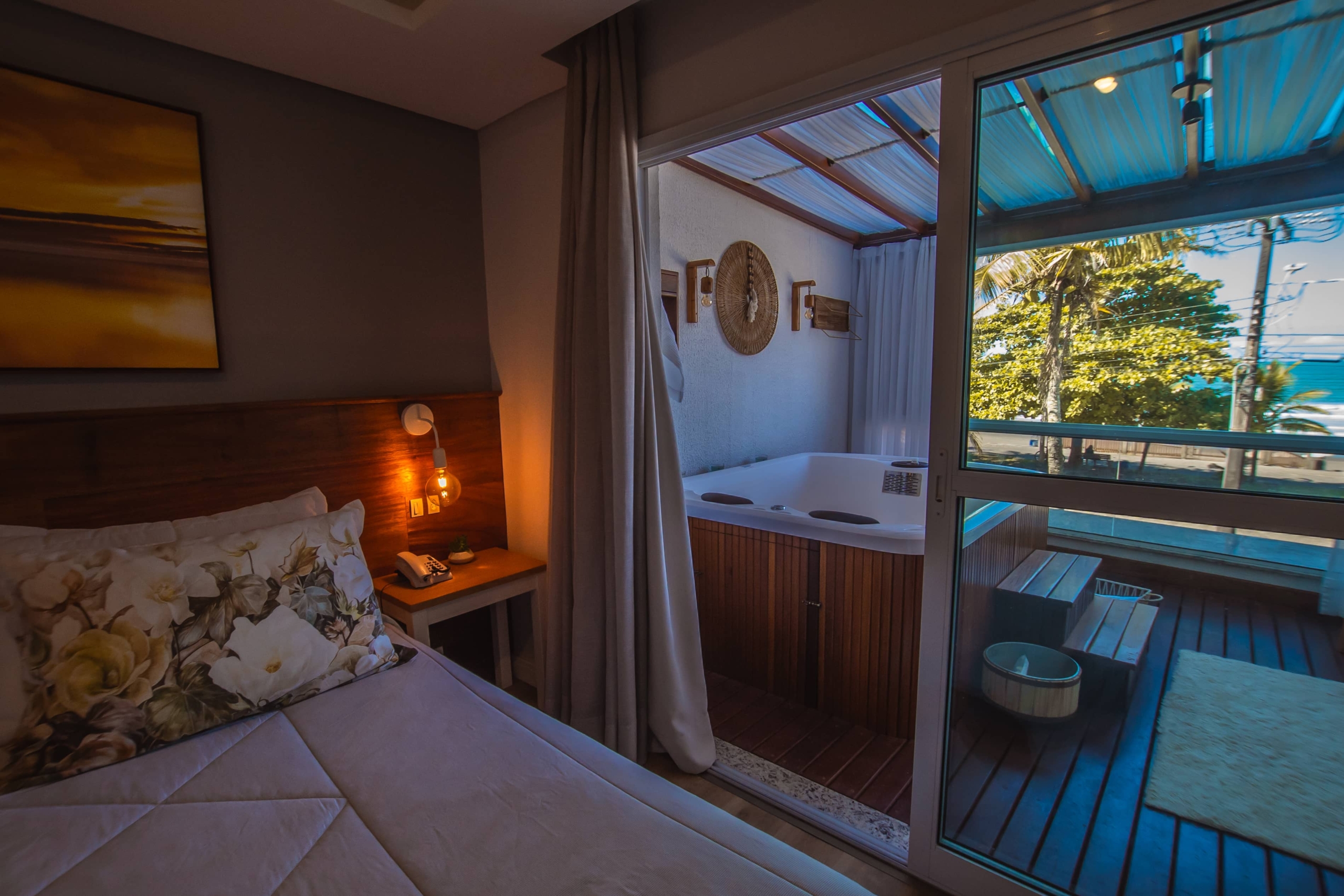 Apartamento com decoração moderna, frente para o mar, com sacada e hidromassagem.
